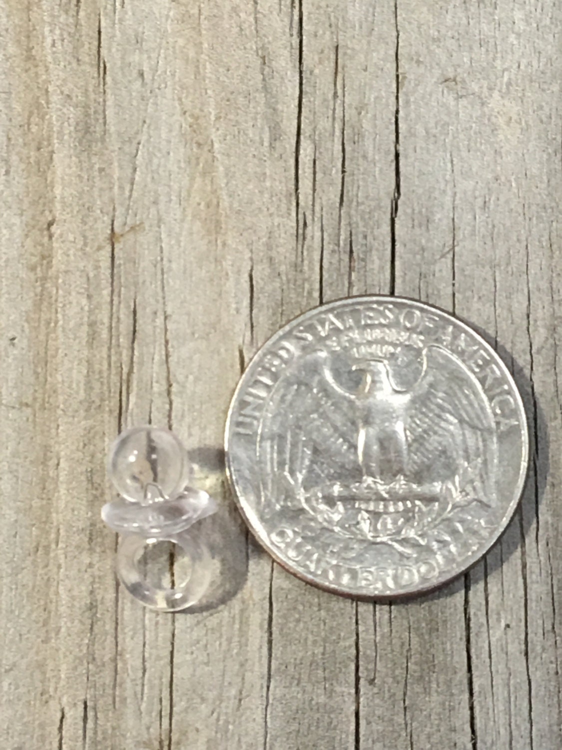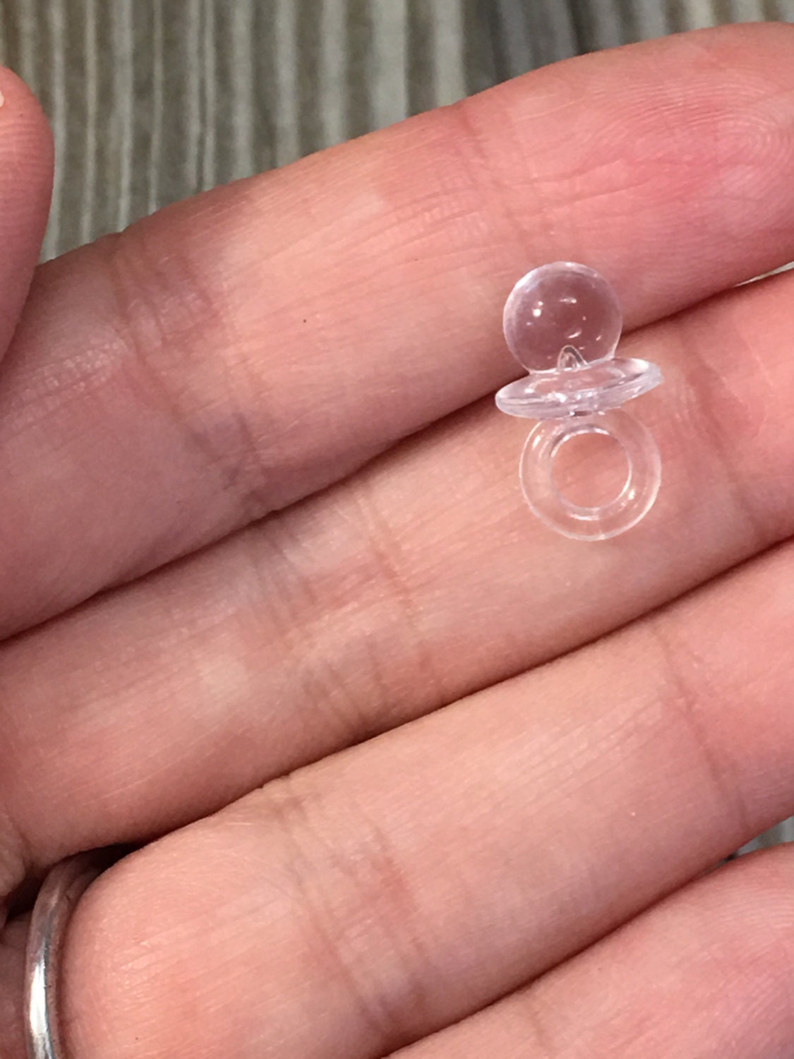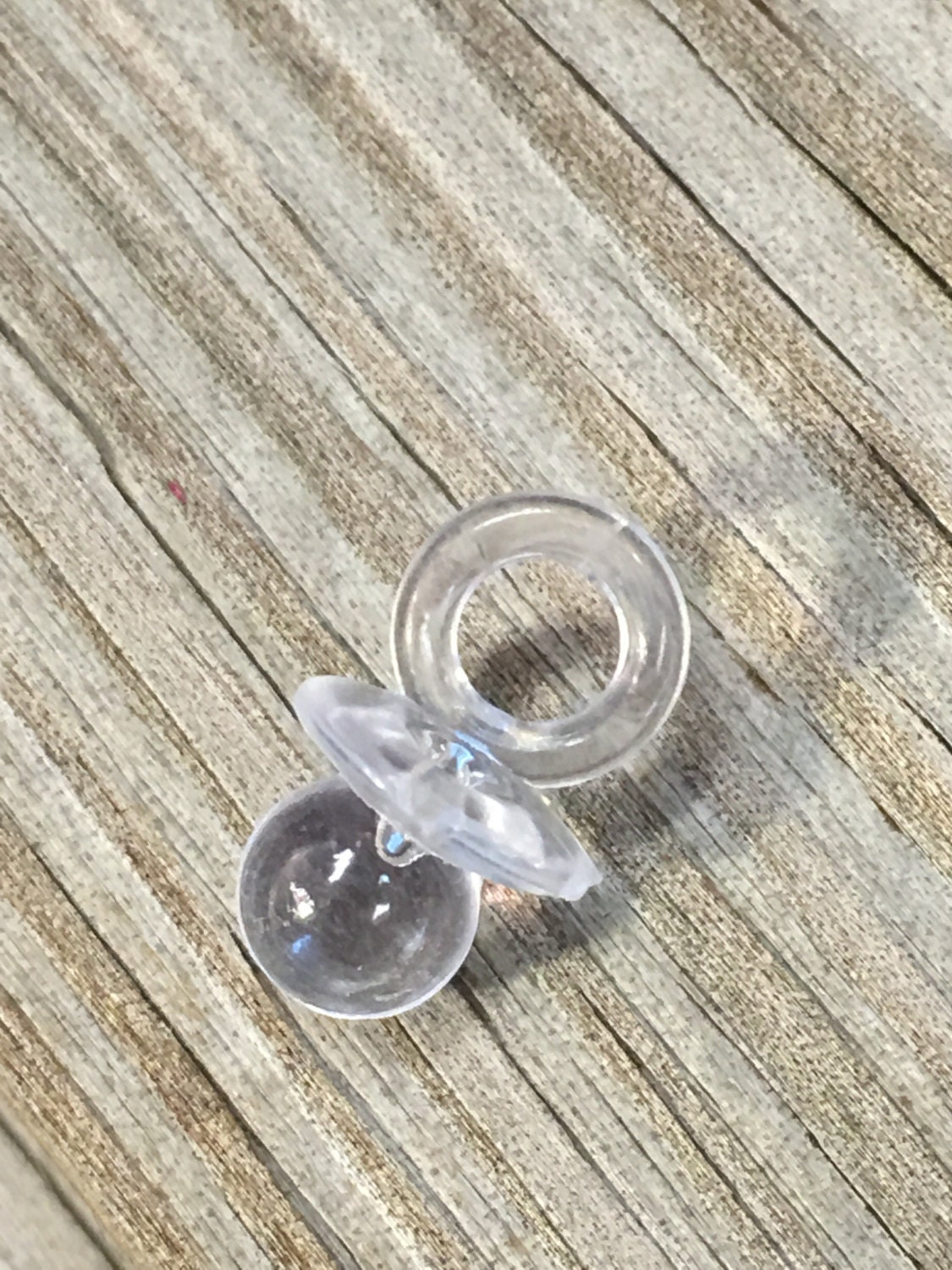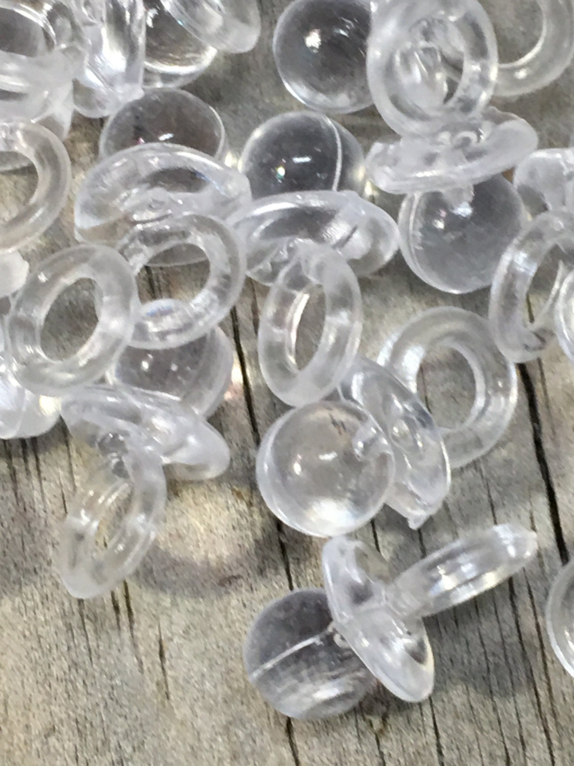 MICRO MINI Clear Acrylic Baby Pacifiers. These are super adorable and can have several uses at your next baby shower. They can be used as table scatter, use them for your baby shower games. Add them to treat and favor bags, or use them as a cupcake decorations. Attach the mini pacifier to other decorations you have already made or to the gifts for your guests. Add your own ribbon and use them as necklaces for the "Don't Say Baby" or other games. Great for gender neutral parties. Can also be used in card or tag making or for scrapbook pages. PLEASE NOTE SIZE OF PACIFIERS IN DETAILS BELOW.